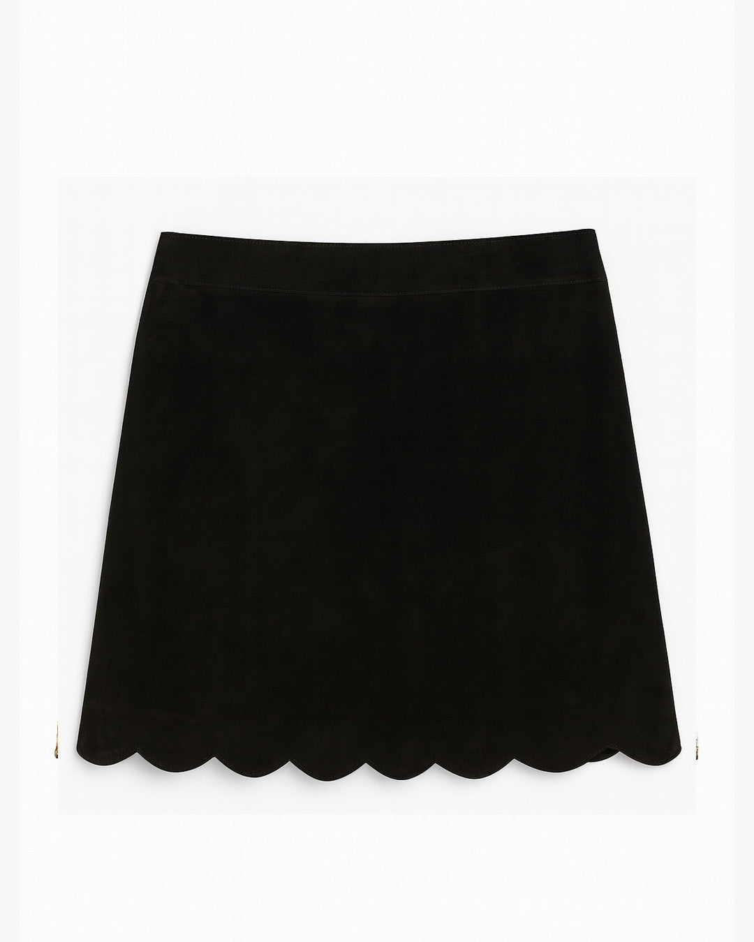 This skirt is a bold celebration of Indian craft brought into a modern, statement silhouette. Rich black cotton forms the base, layered with rows of assorted gold gota florals that shine beautifully against the dark tone. With a stretch-suede back for comfort and a side-zip fastening for a clean fit, this piece blends ease with elegance. Perfect for wedding after-parties, evening soirées, and celebrations where tradition meets a confident, modern mood.