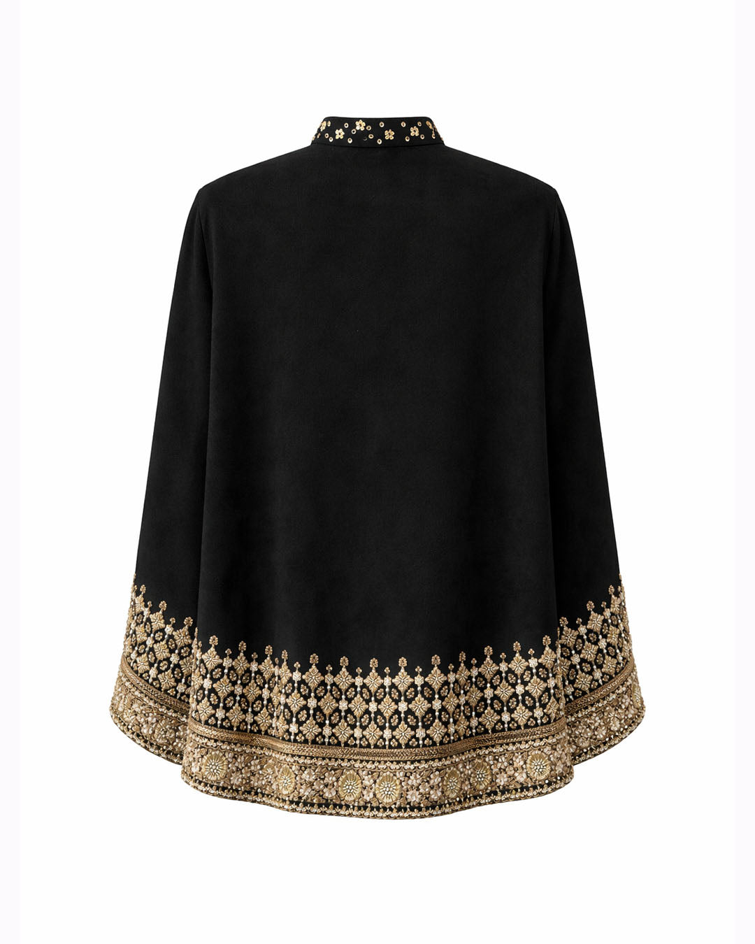 The Black Suede Cape is a timeless layering piece designed to move effortlessly between everyday elegance and occasion wear. Crafted in a rich, luxurious suede fabric, it features delicate hand embroidery concentrated along the hem and neckline, creating a soft glow against the deep black base.