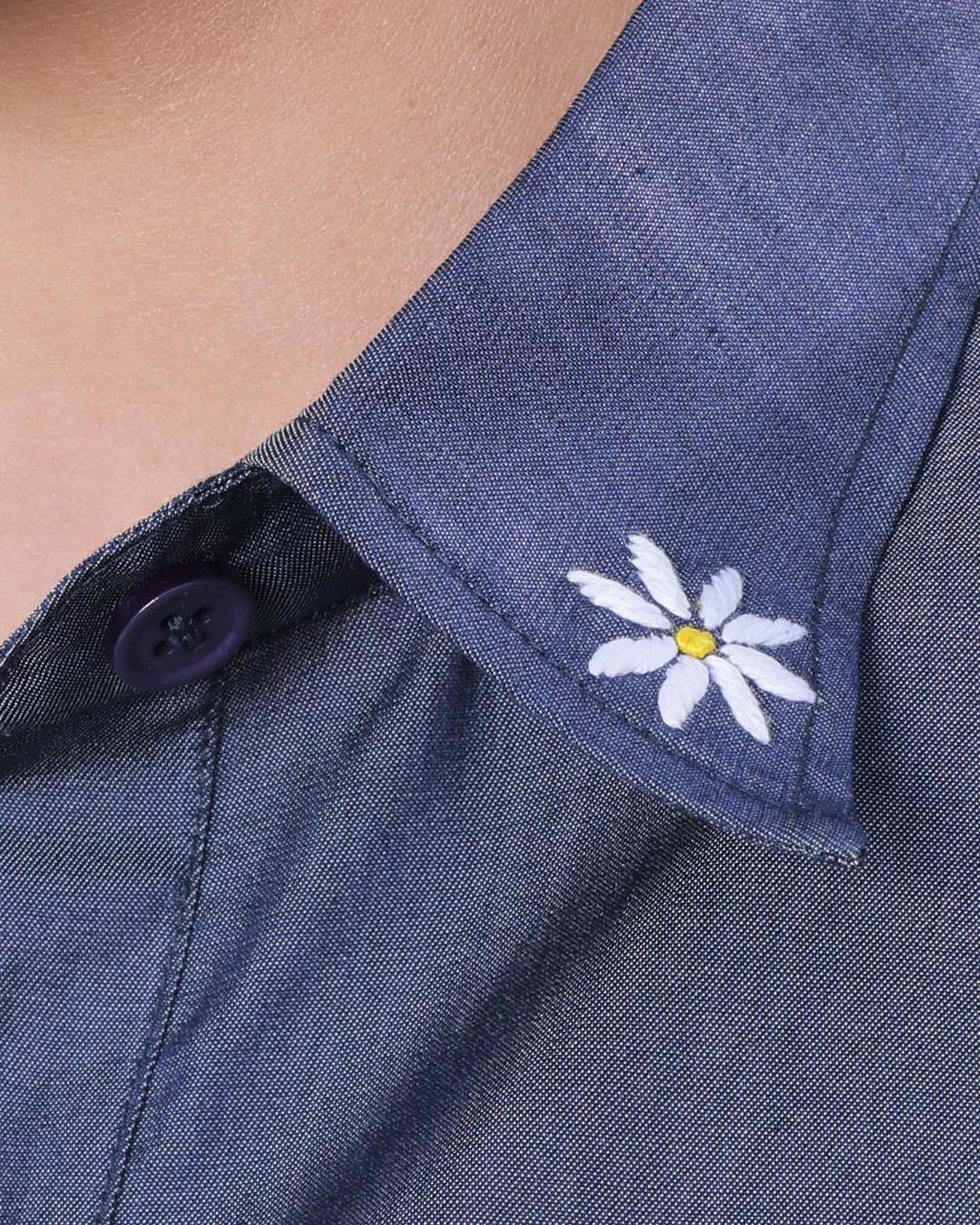 Crafted in soft Tencel Denim, the Sol Back-Buttoned Shirt features delicate hand-embroidered daisies on the collar and back — a quiet nod to sunshine days.