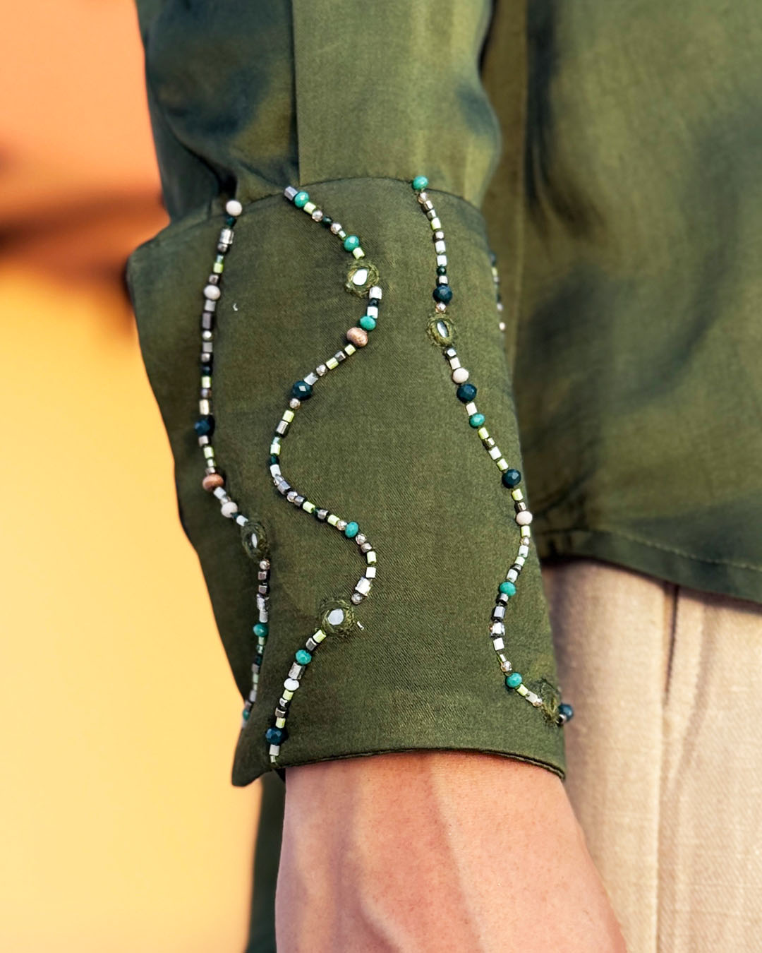 The Vaya Olive Green Shirt is crafted in soft modal satin and hand-embroidered with assorted embellishments in tonal shades of green. Its subtle detailing on the collar and cuffs adds a festive sparkle without overpowering the look. Designed as a versatile separate, it can be styled with our Ahalya Beige Linen Trousers for a co-ord feel or dressed down with denim for an effortless everyday pairing. A piece that balances ease, craft, and timeless wearability.